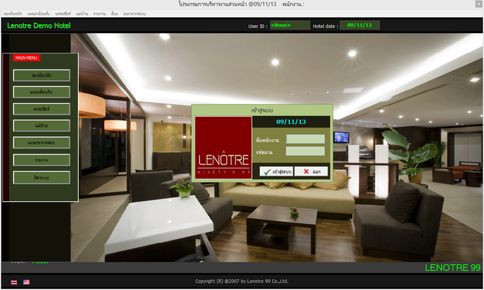 ระบบออฟไลน์ จ่ายครั้งเดียว ครบทุกระบบหลังบ้าน : โปรแกรมบริหารห้องพักประกอบด้วยระบบงานต่างๆในโรงแรม : 1.โปรแกรมการบริหารการจัดการส่วนหน้า FRONT OFFICE SYSTEM . 2.โปรแกรมการบริหารการจัดการภัตตาคารและห้องอาหาร POINT OF SALES . 3.โปรแกรมคำนวณค่าโทรศัพท์และโพสท์อัตโนมัติ CALL ACCOUNTING SYSTEM . 4.โปรแกรมการบริหารการจัดการลูกหนี้ ACCOUNT RECEIVABLE SYSTEM . 5.โปรแกรมการบริหารการจัดการสมาชิก MEMBER MANAGEMENT SYSTEM